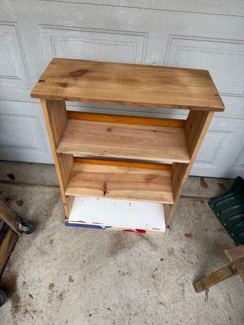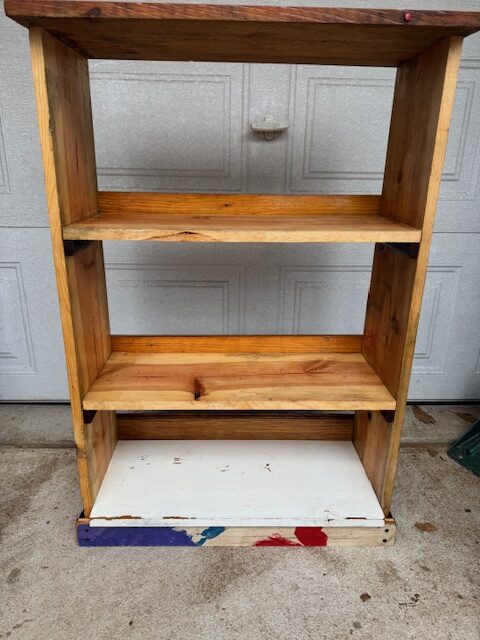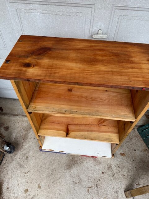 Bookcase / storage shelf. Of course all reclaimed materials ( I mean at this point we have cut down so many trees and made lumber out of them, do we really need much new wood ?) 26 1/2 x 28 x 11 1/2. White pine from salvaged shelving ( from the old Spring Glen Hardware store), oak and maple trim details, from a house and rolling skating rink respectively. Also some American Chestnut detail and yellow pine. Built to accommodate your anvil collection if necessary. finished with shellac.