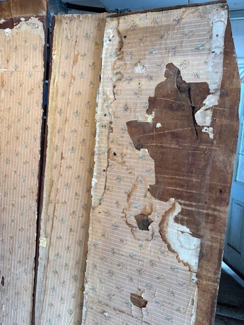 A set of wall boards from a 1753 house. About 50 square feet , boards about 16-24″wide. and about 7 feet tall. ( in other words about 7 running feet of wall 7 feet tall. All numbers approximate. Ultimately the best use of this materials would be restoring an 18th century house. But the next best use is it will become furniture. Price for all is $ 525 +tax.