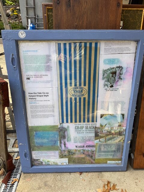Yale Co-Op history. A vintage Yale Co-Op bag ( c. 1960’s ?), mounted copies of news articles and graphics. 32″ wide x 42 ” tall ,c. 1900 wood sash frame from a house on Cols Spring Street in New Haven. $12500
