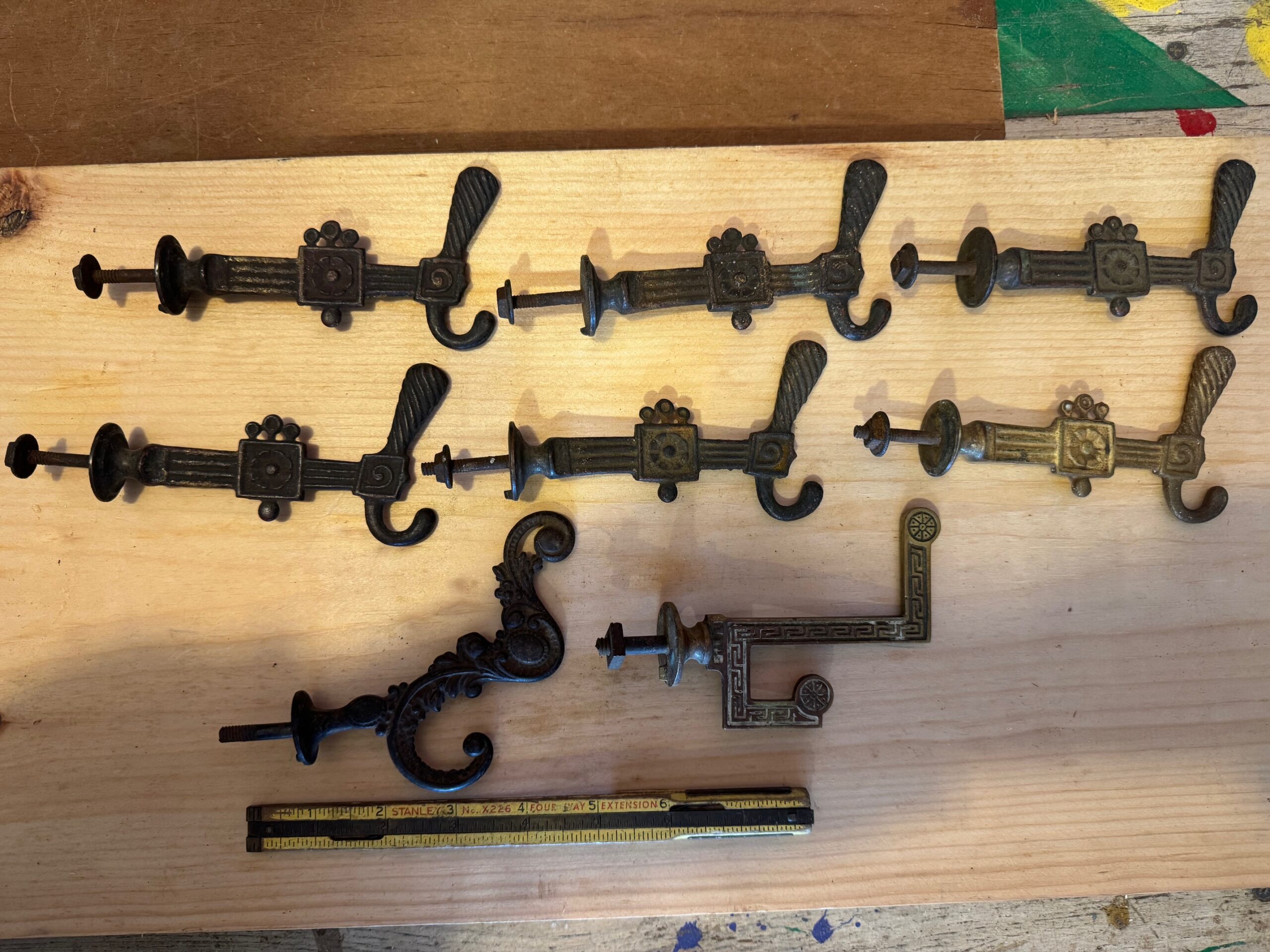 A set of antique brass /bronze Victorian / Eastlake hooks ( Except hook in lower left is iron). total eight large hooks.