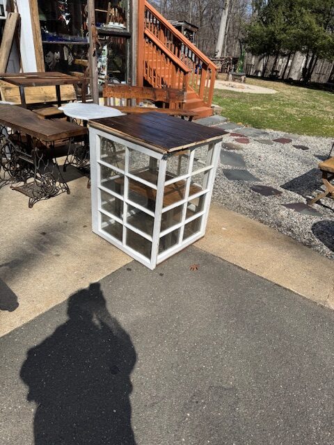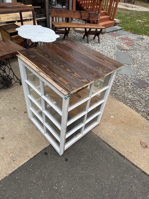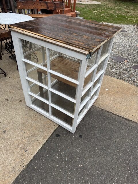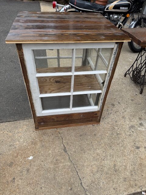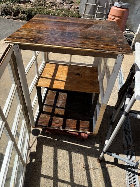 Cold frame. mini green house ? potting table with plant storage ? inside cabinet for house plants for people with nuisance cats that try to eat them ? add legs for it to be a ” free library of things”? add a shelf midway for more storage capacity ( done) ? made with c. 1984 flooring just recently salvaged from Old Saybrook and mid century window sash from a house in West Hartford. And mahogany boards from a house in Durham.37 1/2 ( work table height ) tall by 30 x 31 ( outside dimensions.) Top seams are sealed. SOLD !