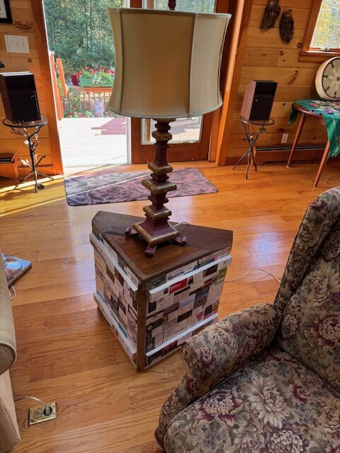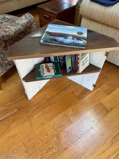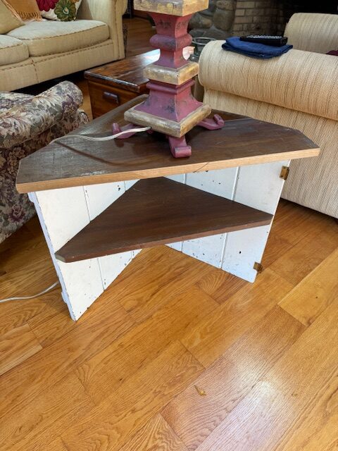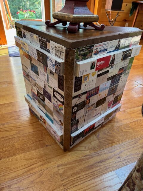 Calling this a ” card table” well, because it has current and vintage Hamden business cards on it. The sides are salvaged cabinet doors from some living room cabinets from a house in Westport. The top and shelve are Poplar boards recovered from a pantry cabinet in a C 1900 house in New Haven. The corner detail is plaster lath from the same 1900 house. Business cards locally collected.