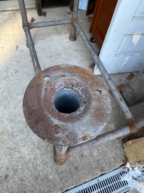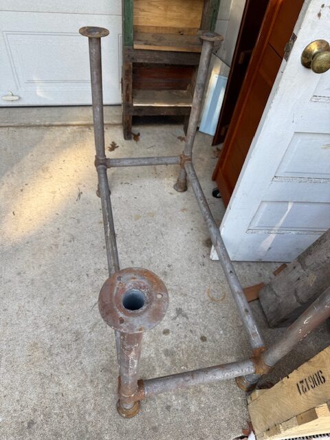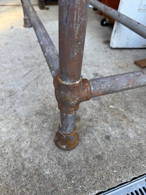 Industrial pipe antique table base with bubble joints. Has levelers ! 31 tall x 22 x 44. Not the welded mounting brackets. This table base will look great cleaned up a little ,and would not flinch with two people jumping up and down on it. Getting harder to find these at a reasonable price.