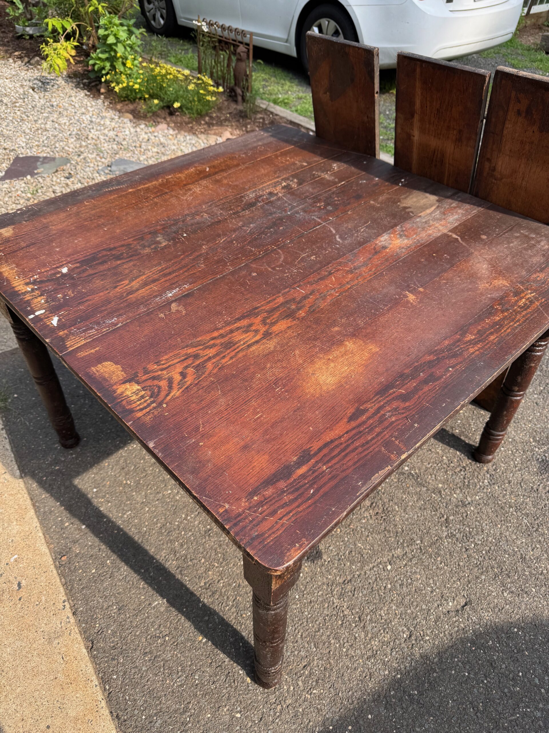 Antique Oak table. 42 x 42, but wait, three inserts totaling 28″, so the table can enlarge to 42 x 70″. AND a center leg to support that expanse. sure it needs cleaning up, but that’s why you can have it for $80.00.